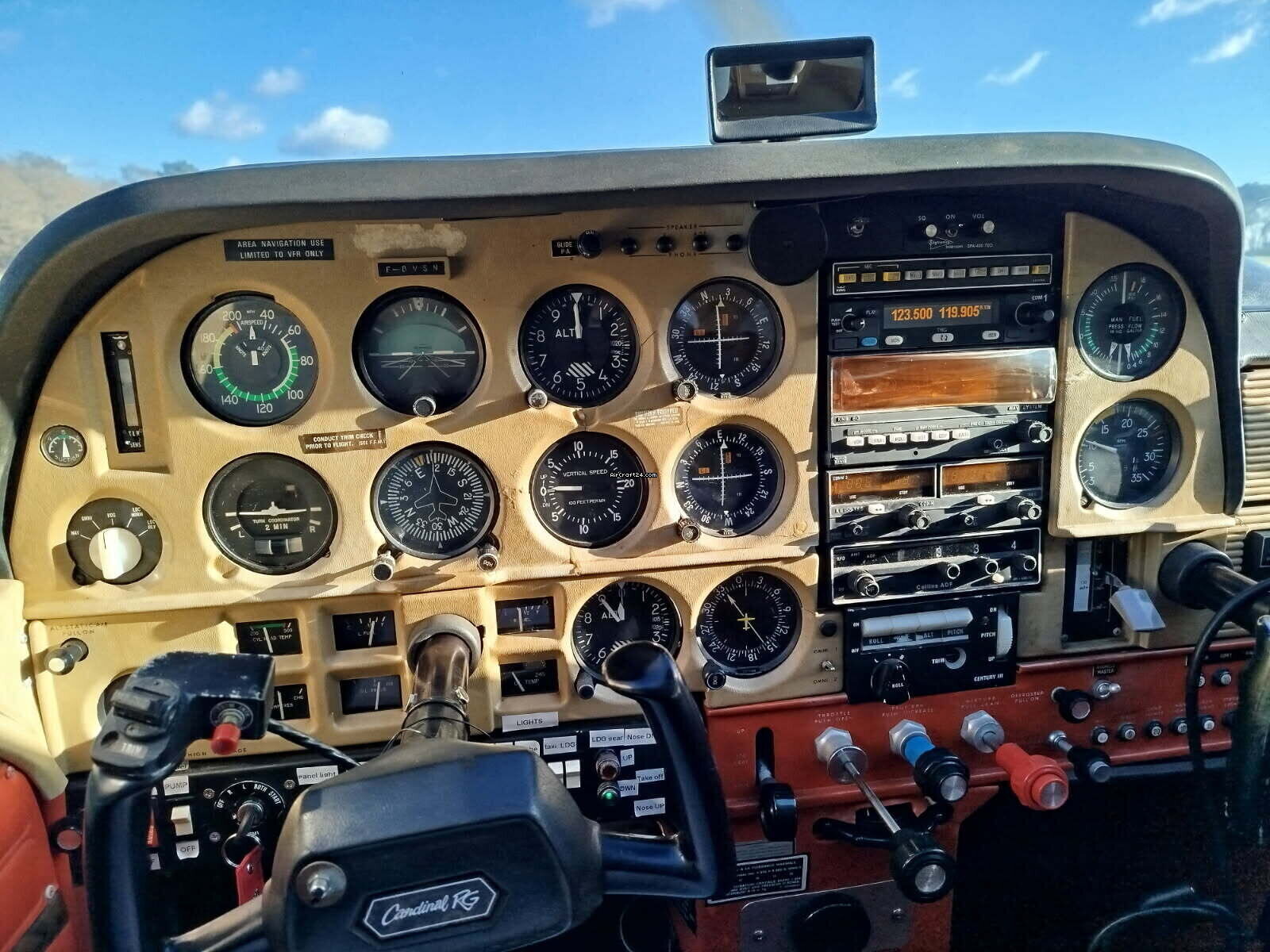| Base data | | Type: | Single Prop | | Make: | Cessna | | Model: | F-177-RG CARDINAL | | Year built: | 1974 | | Registration No.: | F-BVSN | | Serial No.: | 102 | | Attributes: | Always hangared | | Last annual: | 2/2026 | | Location: | France, PAMIERS, LFDJ | | Total Time (TTAF): | 4210 h | | Price: | € 78,000 (~ AUD 128,965) | | EU VAT paid: | yes | | No. of passengers: | 4 |